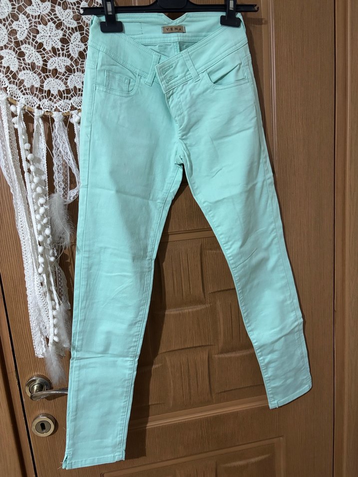 Turkuaz renkli, düğmeli ve pastel tonlarda, dar kesim denim pantolon. Bedeni 26/28.
