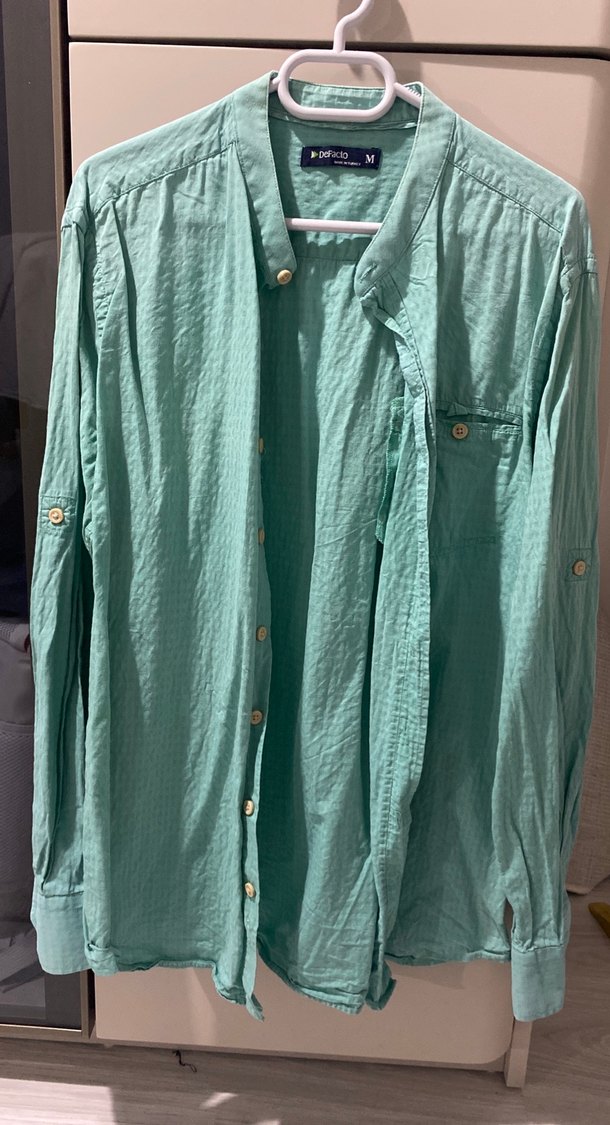 Turkuaz pastel keten kumaştan, düğmeli, uzun kollu, geniş kesim erkek gömleği. Notlu yaka detayıyla günlük rahat stil için uygundur.