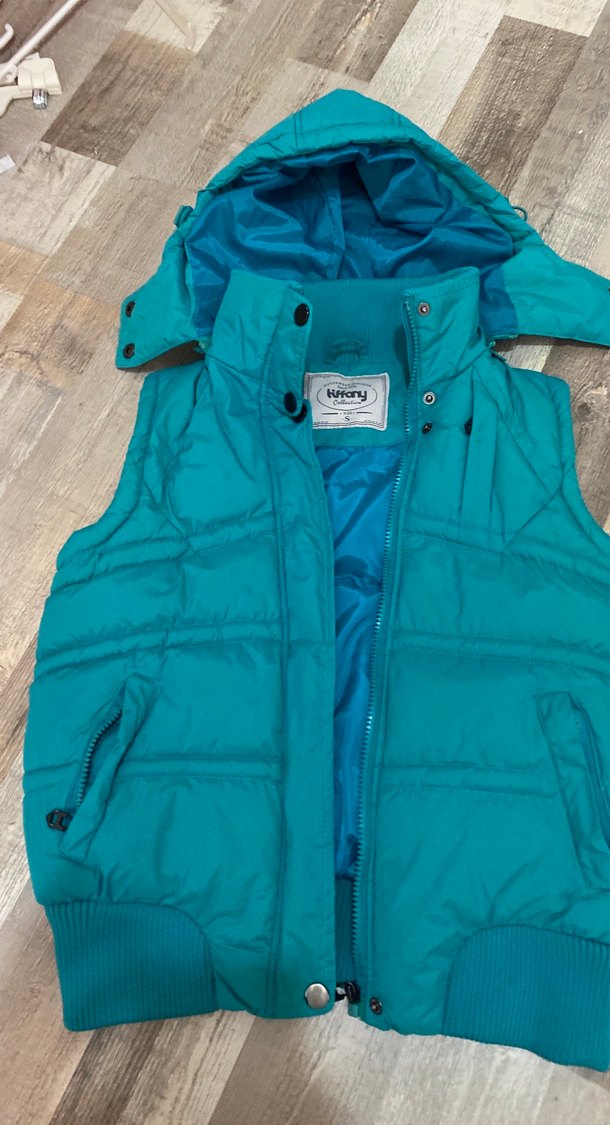Düğmeli, yakalı ve fitted kesimli turkuaz kadın yelek. Yumuşak ve sıcak kumaştan, normal boyda, dış mekan kullanımı için uygun.