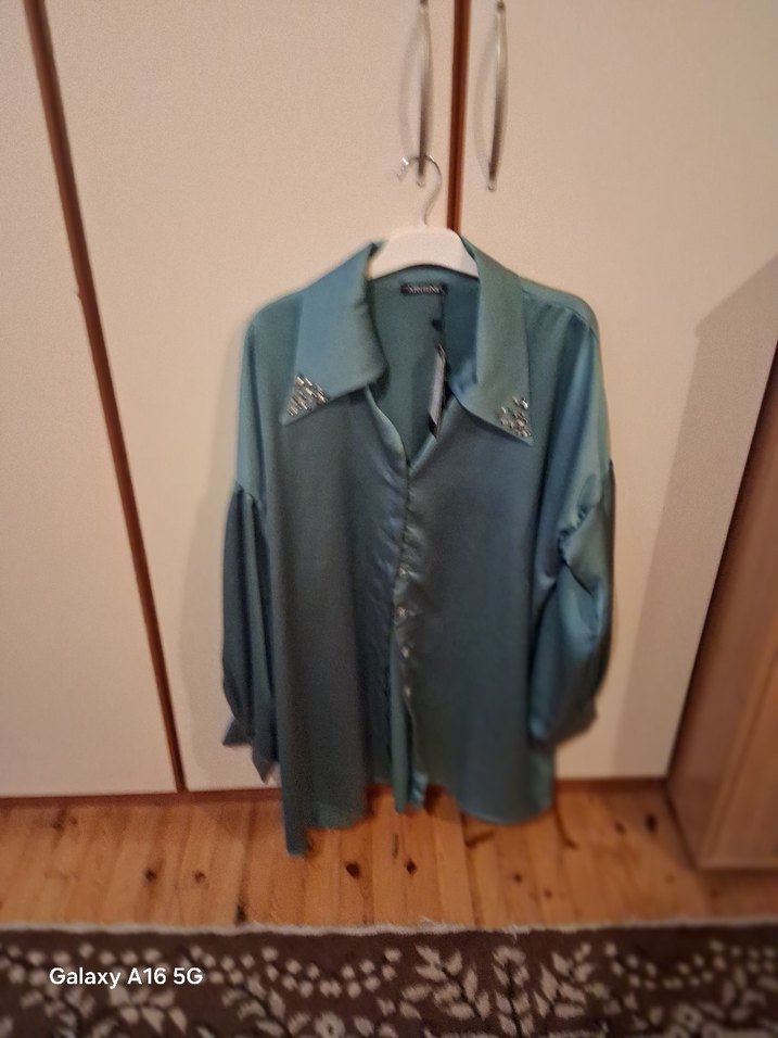 Turkuaz renkli, düğmeli, yakalı ve uzun kollu kadın gömleği. Parlak, ipeksi kumaştan yapılmış, midi boyda, rahat kesim ve günlük sokak stiline uygun.