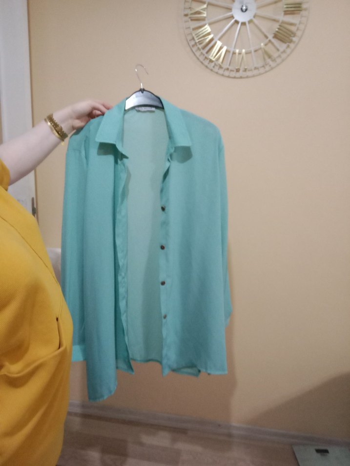 Turkuaz renkte, uzun kollu, yakalı ve düğmeli salaş kesim gömlek. İpeksi dokusu ve sade tasarımıyla günlük rahat kullanım için uygundur.