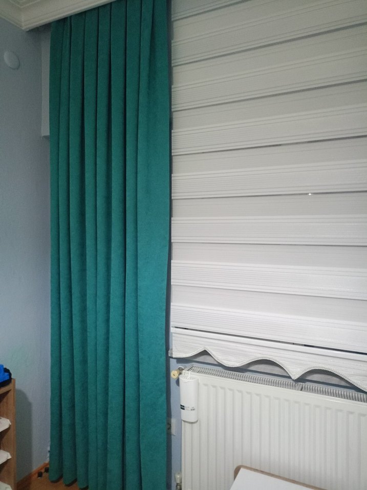 Turkuaz düz renk fon perde, klasik tarza sahip olup odadaki gri tonlarla uyum sağlar. Pencereler için sade ve şık bir görünüm sunar.