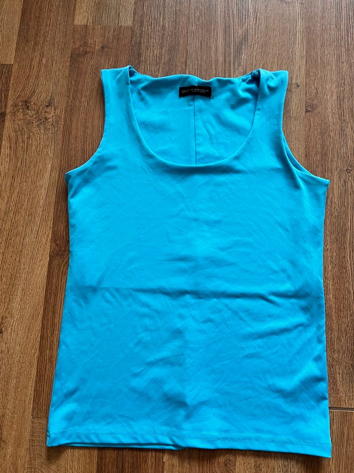 Fitted kesim, yuvarlak yaka ve kolsuz tasarıma sahip turkuaz kadın atlet. Düz ve parlak sentetik kumaştan, spor ve sokak stili için uygun.