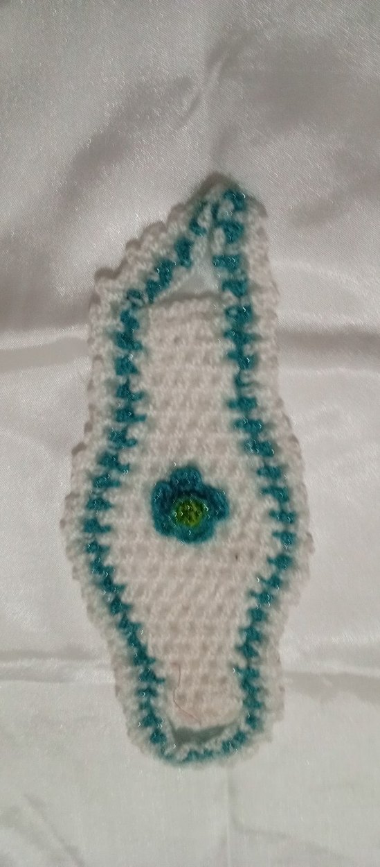 Hafif turkuaz renkte, el örgüsü banyo süngeri, dekoratif çiçek detayıyla. Yumuşak dokusu nazik temizlik sağlar.