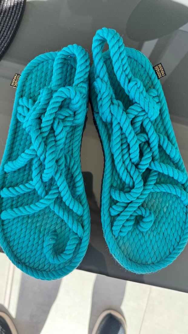 Yumuşak kauçuk malzemeden, elastik bantlı ve platform topuklu turkuaz kadın sandaletleri. Bohem tarzda, günlük kullanım için uygundur.