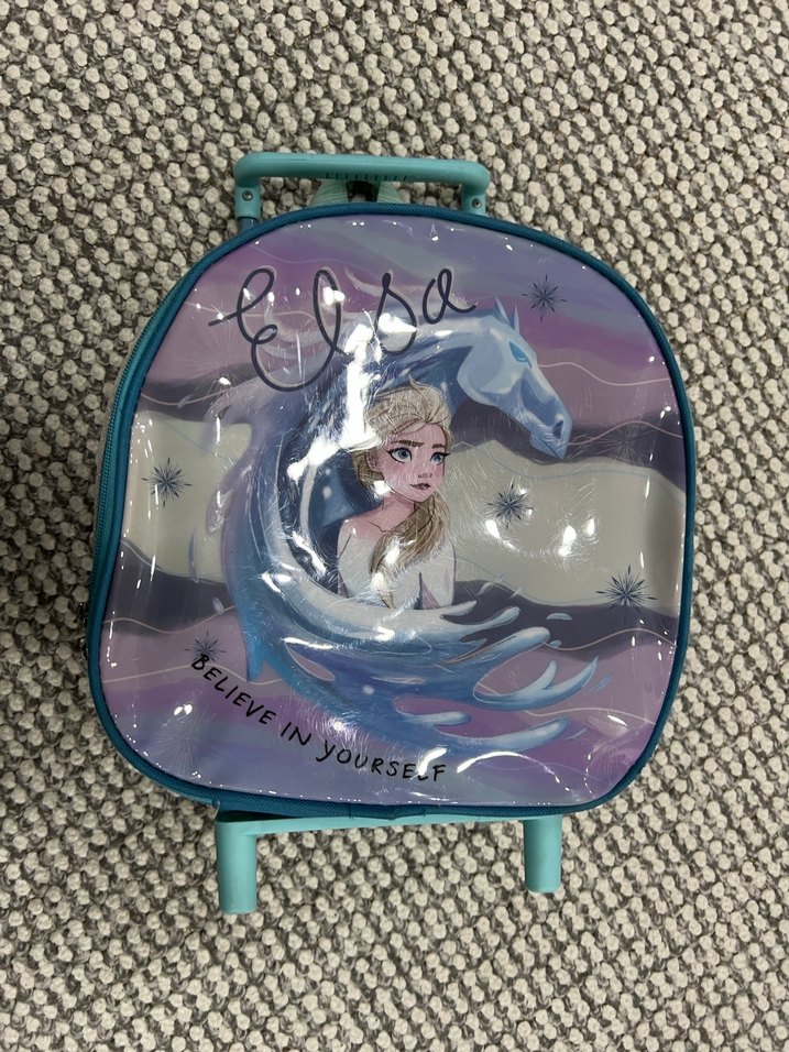 Pastel turkuaz renkli, Elsa desenli çekçekli okul çantası. 'BELIEVE IN YOURSELF' yazısı ve sağlam sapı ile kolay taşınır.