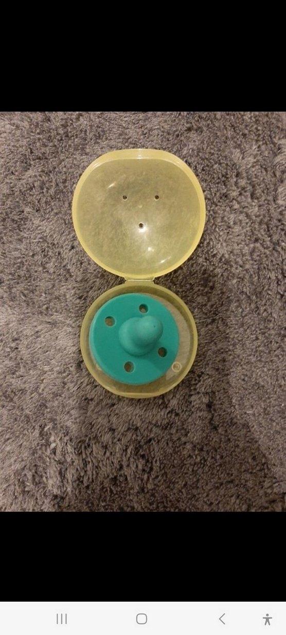 Havalandırma delikleri bulunan sarı kutuda saklanan pastel turkuaz renkli emzik. Hijyenik ve kolay saklama sağlar.