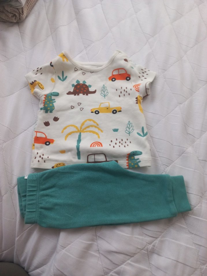 Renkli baskılı kısa kollu, bisiklet yaka üst ve turkuaz örme pantolondan oluşan bebek erkek takımı. Yumuşak kumaşıyla rahat kullanım sağlar.