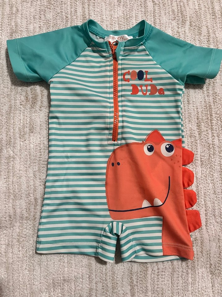 Turkuaz renkli, kısa kollu erkek çocuk mayosu, renkli dinozor baskısı ve ön fermuar detayına sahiptir.