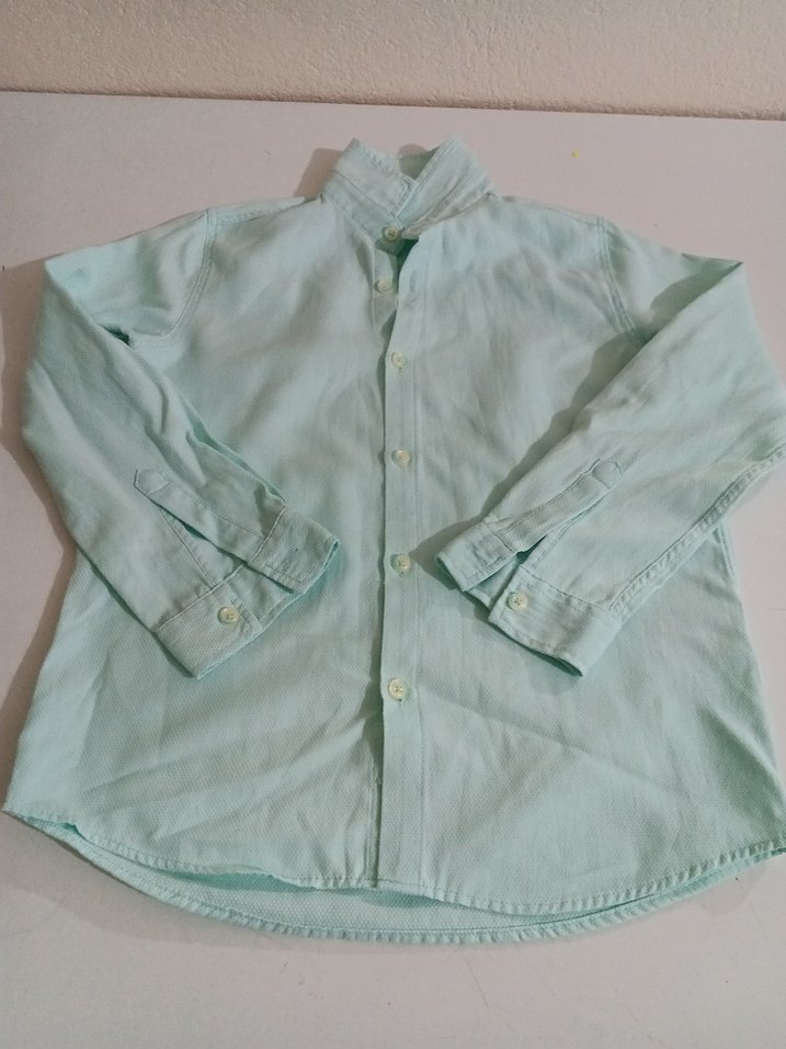 Turkuaz renkte, keten kumaştan üretilmiş, düğmeli uzun kollu, yakalı ve regular fit erkek çocuk gömleği.