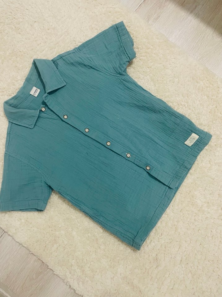 Turkuaz renkli, keten kumaştan yapılmış, düğmeli ve yakalı erkek çocuk gömleği. Rahat oturan ve desen içermeyen sade bir tasarıma sahiptir.