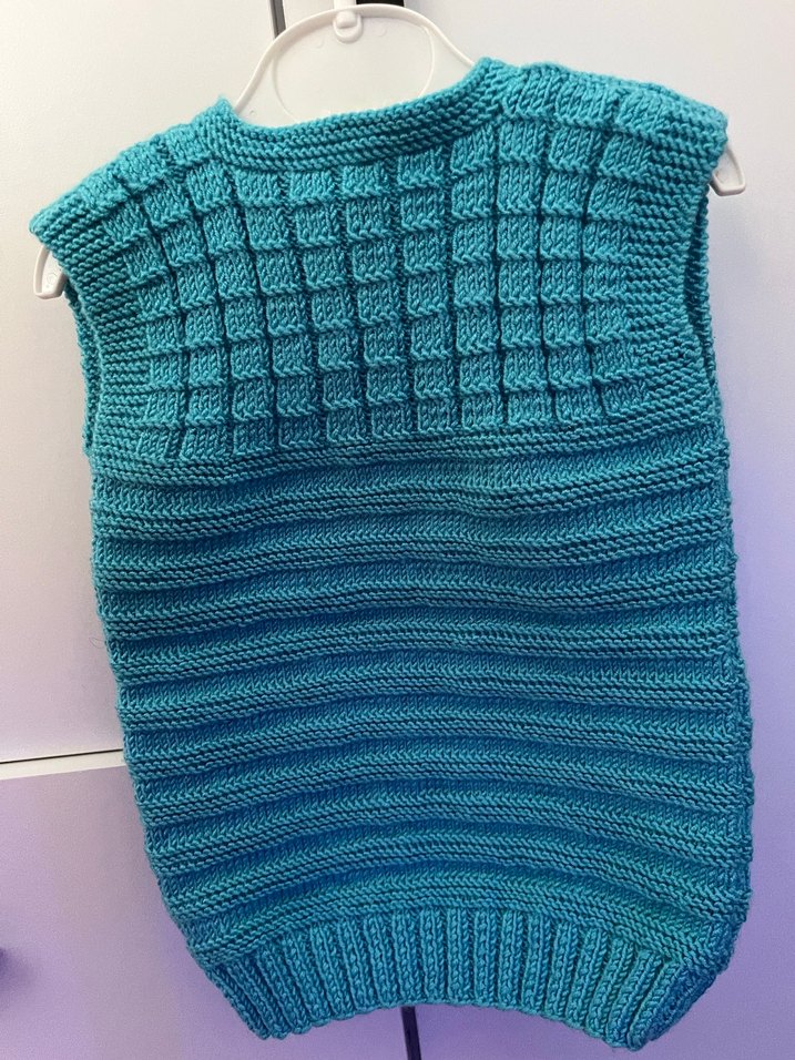 Erkek çocuklar için turkuaz renkli, örgü kumaştan yapılmış, düğmeli, yuvarlak yakalı, kolsuz ve bol kesim süveter.
