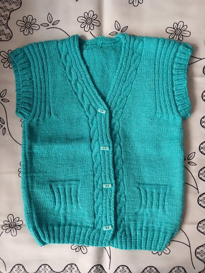 Yeni örüldü taptaze Erkek çocuk yelek Turkuaz renkli, V yaka, düğmeli erkek çocuk örgü süveter. Fitted kesim, kolsuz ve iki ön cepli bohem tarzda, yumuşak örgü kumaştan yapılmıştır.