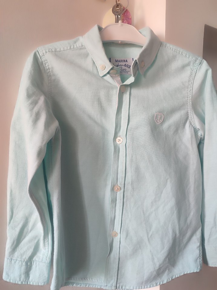 Turkuaz renkte, uzun kollu, düğmeli ve yakalı erkek çocuk gömleği. Pamuklu yumuşak kumaştan, rahat kesime sahiptir. temiz kullanıldı sorunsuz