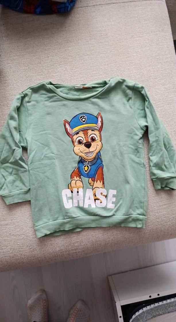 Turkuaz renkli, uzun kollu, bol kesim erkek çocuk sweatshirtü. Yumuşak kumaştan, düğmeli ve "CHASE" baskılı desenlidir.