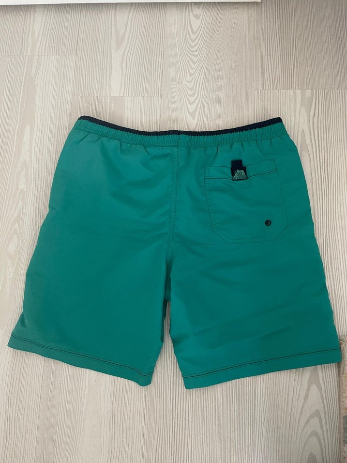 Arka cep detaylı, turkuaz renginde, bol kesim erkek deniz şort. Plaj için uygundur.