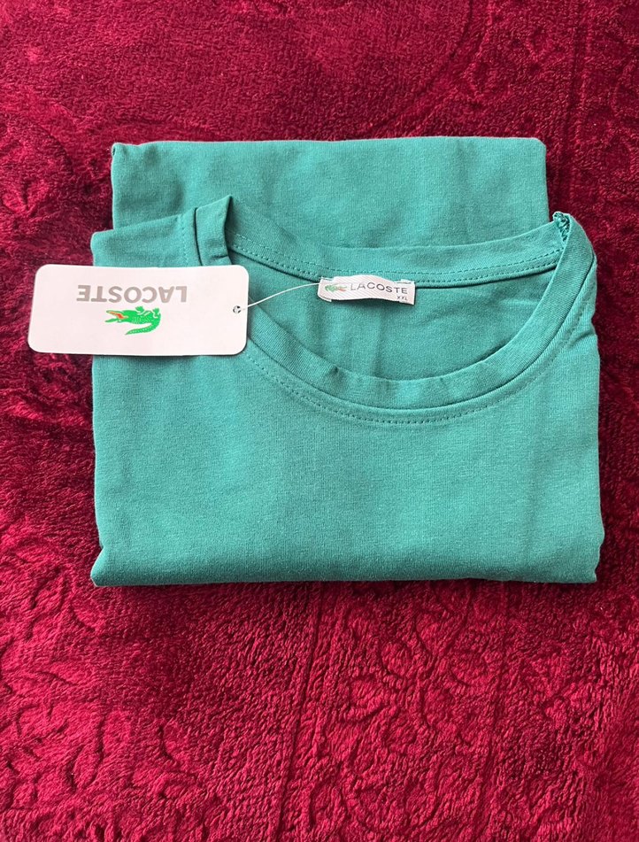 Turkuaz renk, kısa kollu, bisiklet yaka pamuk erkek tişörtü. Rahat kesimli ve hafif baskılı, günlük sokak giyimi için uygun.