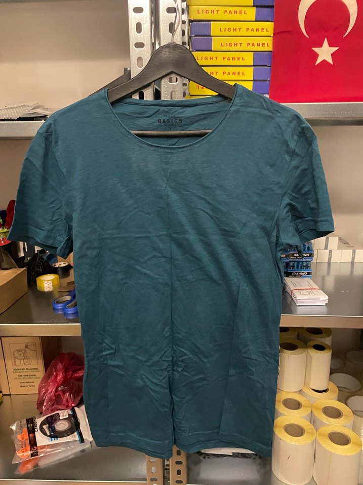 Turkuaz renk, kısa kollu ve yuvarlak yakalı bu erkek tişörtü, rahat kesimi ve yumuşak sentetik kumaşıyla günlük sokak stiline uygundur.