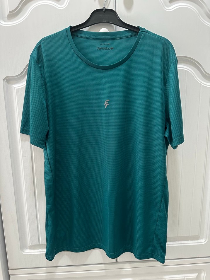 Turkuaz renkli, rahat kesim, yuvarlak yaka erkek tişört. Yumuşak sentetik kumaştan, baskılı desenli, günlük rahat stil için uygun.