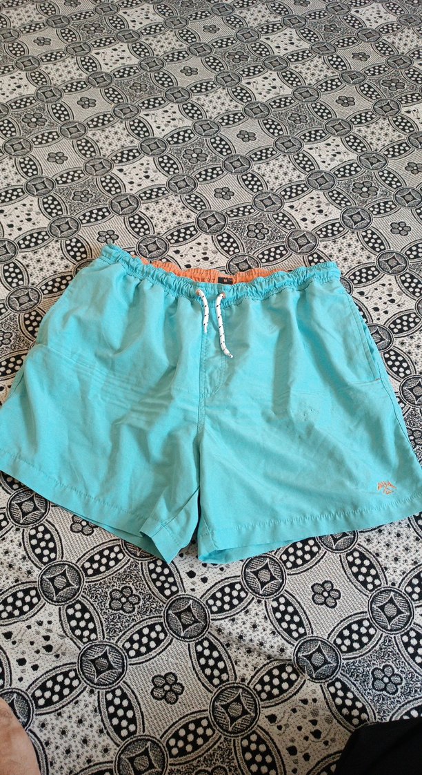 Turkuaz renkli, bol kesim erkek mini şort. Lastikli bel ve bağcık detayıyla plaj ve sokak stili için uygun, renkli ve rahat bir şıklık sunar.