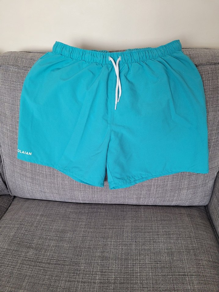 Turkuaz renkli, bol kesim ve lastikli beli olan erkek mini şort mayo. Düz ve yumuşak sentetik kumaştan, plaj ve sokak stiline uygun. 1-2 defa giyildi..