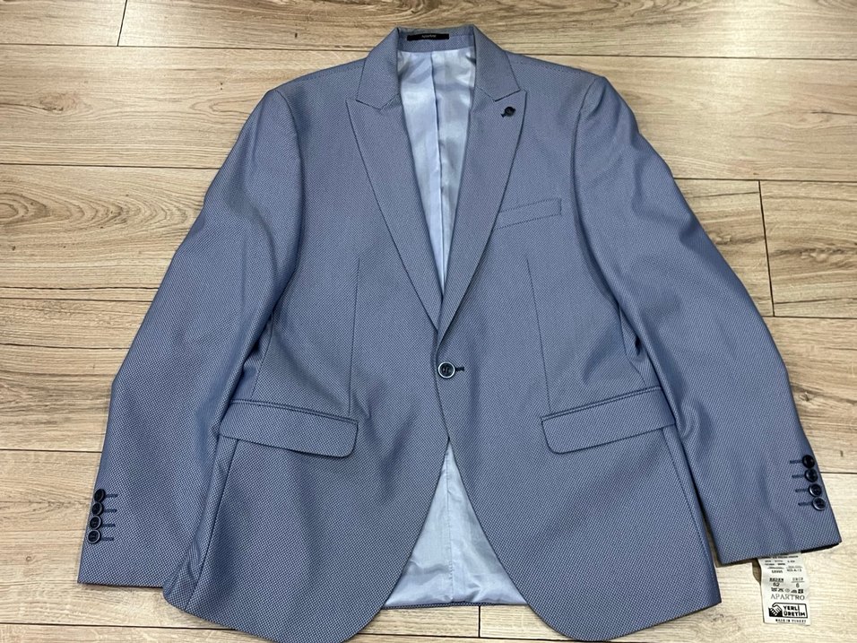 Turkuaz renkte, düğmeli ve notched yakalı erkek ofis takım ceketi. Uzun kollu, regular fit ve klasik iş ortamları için uygun.