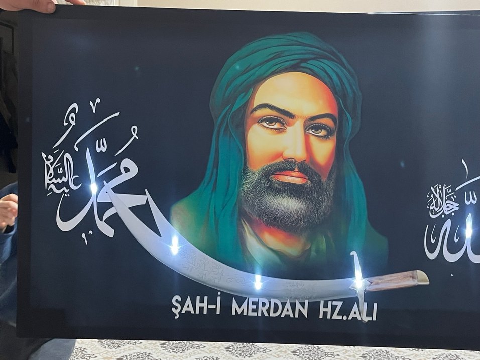 Modest ve geleneksel tarzda, bohem etkili koyu turkuaz renkte Şah-ı Merdan Hz.A yazılı erkek rozeti. ️
