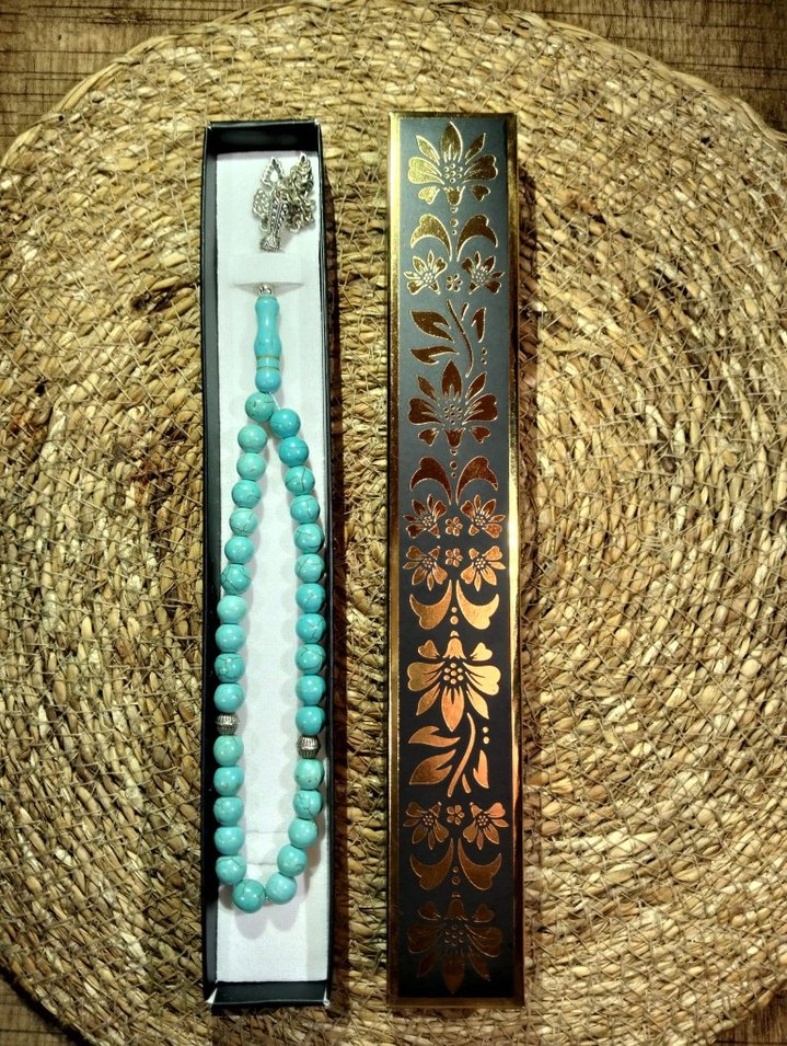Turkuaz renkte, renkli ve bohem tarzda erkek tesbih. Geleneksel tasarıma sahip ve şık kutusunda sunulur.