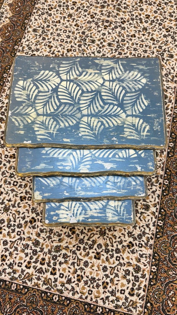 Turkuaz eskitme vintage görünümlü el boyama zigon dört adet sehpa. Üzerindeki boyalarda bazı deformasyonlar vardır ama eskitme olduğu için çok belli olmamaktadır. Kullanıma uygundur.