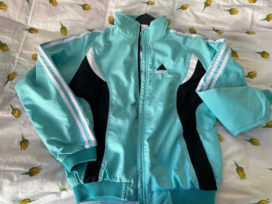 Fermuarlı ön kısmı ve uzun kollu, turkuaz parlak renkte Adidas marka, yumuşak ve sıcak kumaştan, normal boyda, spor ve şık sokak stili ceket.