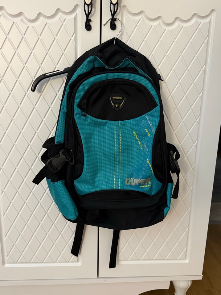 Turkuaz renkli, fermuarlı bölmeleri ve baskılı deseni olan kadın sırt çantası. Sokak stili ve athleisure için uygun, renkli ve trend görünümlü.