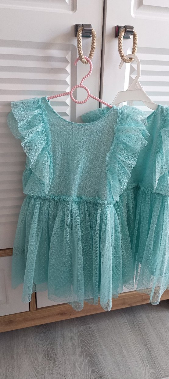 Fırfır detaylı, nakışlı, turkuaz renkte kolsuz kız çocuk elbisesi. Salaş kesim ve yuvarlak yaka, yumuşak sentetik kumaştan. biri 24-36 biri 3-4 çift fiyatıdr