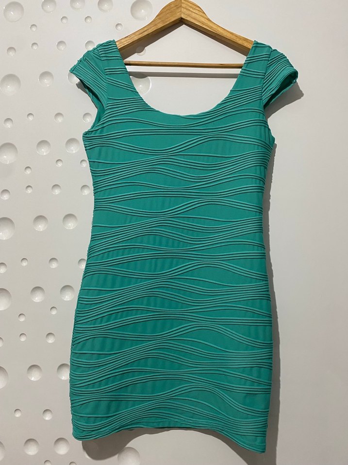 Turkuaz renkte, tekne yaka ve kısa kollu, fitilli dokulu midi triko elbise. Renkli, çağdaş tarza sahip, günlük kullanıma uygun.