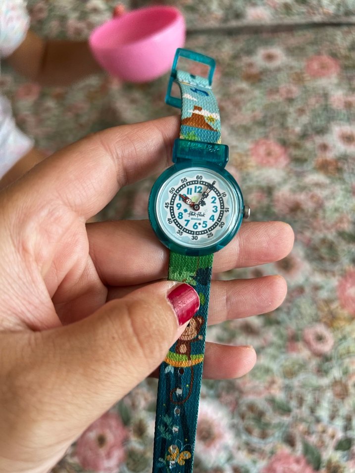 Turkuaz renkte, tokalı ve renkli desenli kayışa sahip, yuvarlak kadranlı çocuk su geçirmez kol saati. ⌚