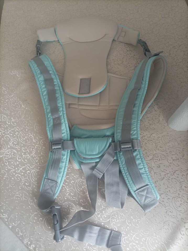 Turkuaz ve gri tonlarda, yumuşak dolgulu askılar ve destekli oturma alanına sahip bebek taşıyıcı.