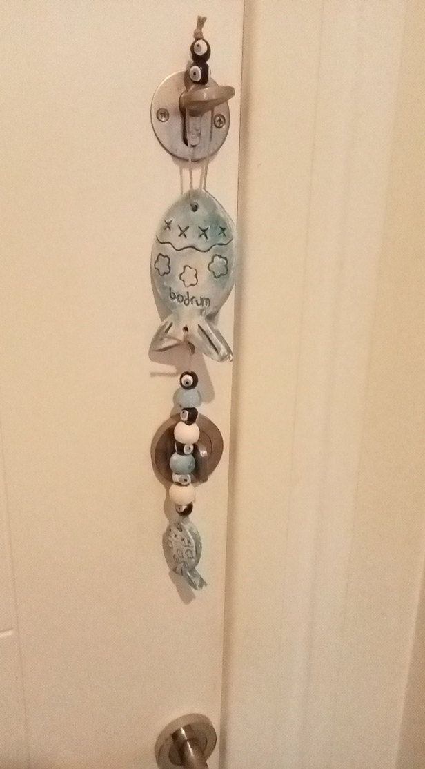 Turkuaz ve gri renklerde, Bodrum yazılı boncuklu ve balık figürlü dekoratif duvar süsü. Mekâna şıklık katar.