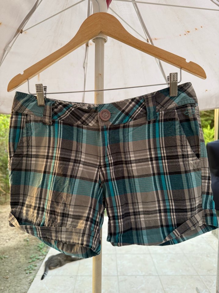 Turkuaz ve gri ekose desenli, bol kesim, tokalı mini hamile şortu. Rahat ve günlük dış mekan kullanımı için uygundur. İadem yoktur