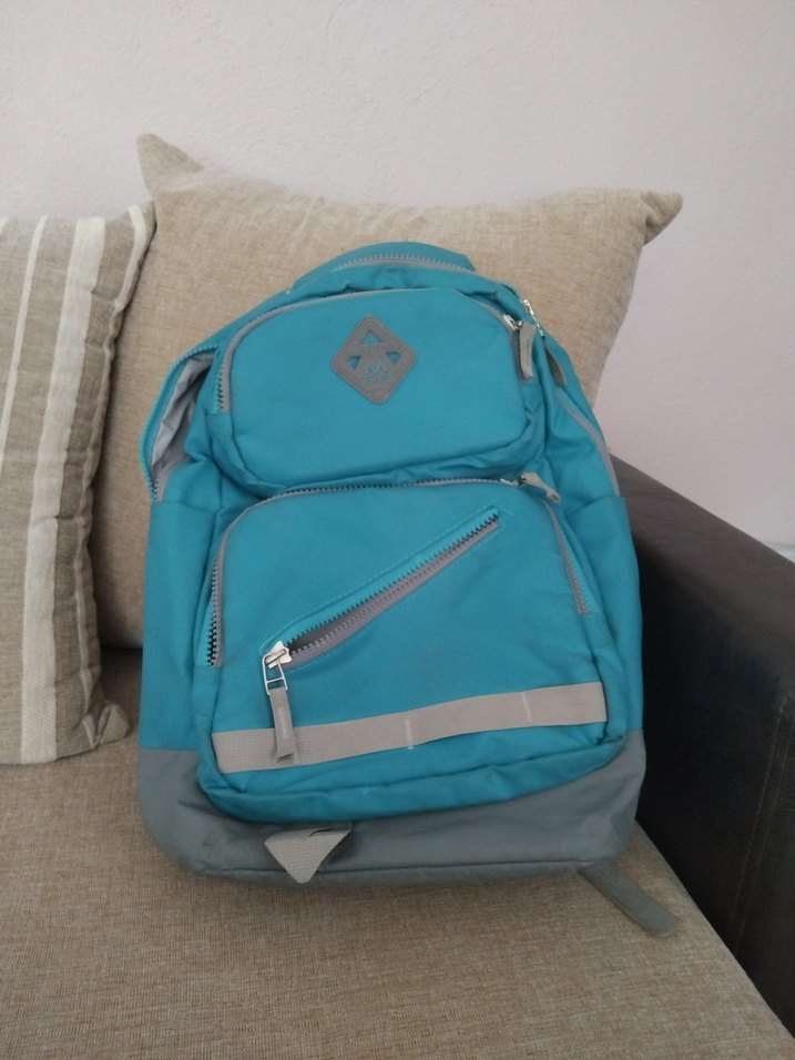 Turkuaz ve gri renklerde, yumuşak tüylü kumaştan yapılmış, fermuarlı bölmeleriyle günlük kullanıma uygun şık bir sırt çantası.