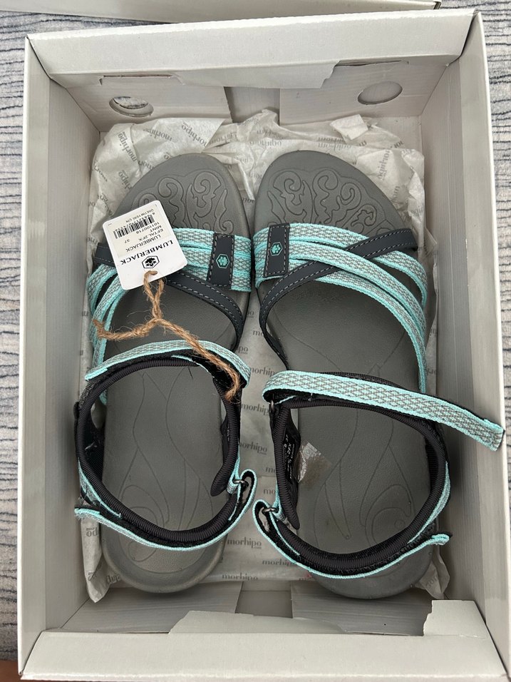 Turkuaz ve gri renklerde, baskılı kauçuk tabanlı, cırt cırtlı bantlara sahip kadın sandalet. Çok rahat, 37 numara tam kalıp. Arka ve önde 2 adet ayarlanabilir cırt cırtı mevcut.