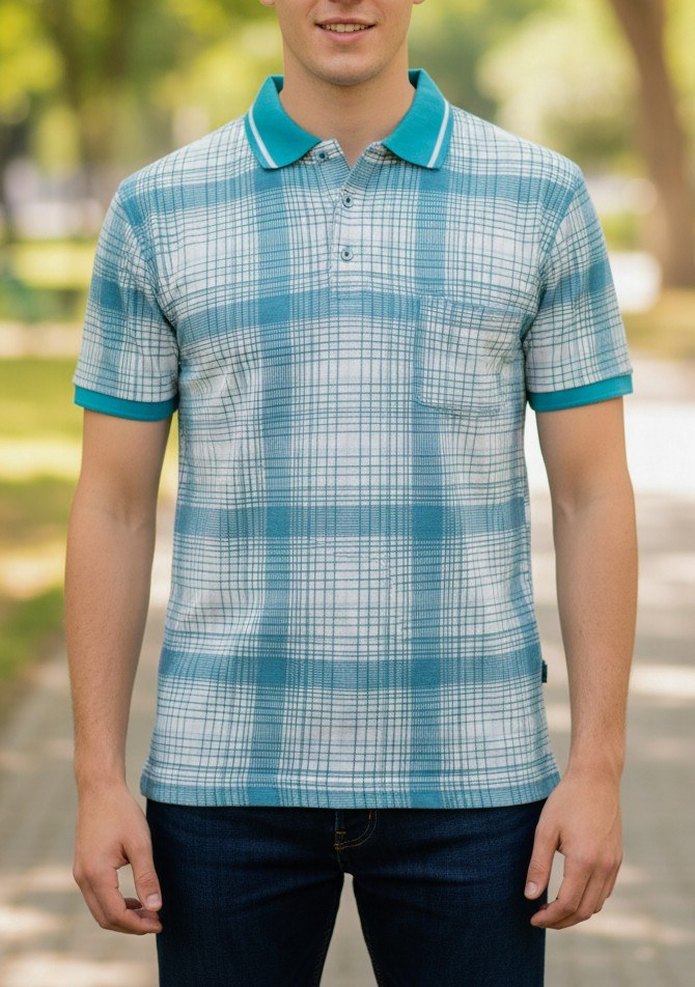 Turkuaz ve gri kare desenli, düğmeli ve cep detaylı kısa kollu polo tişört. Regular fit ve sentetik kumaştan, günlük kullanım için uygundur.