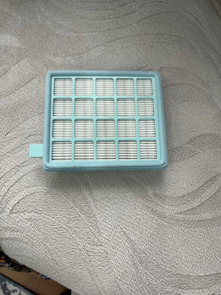 Turkuaz ve gri renklerde,toz tutma için ızgara tasarımlı vakum filtresi. Standart modellerle uyumludur.