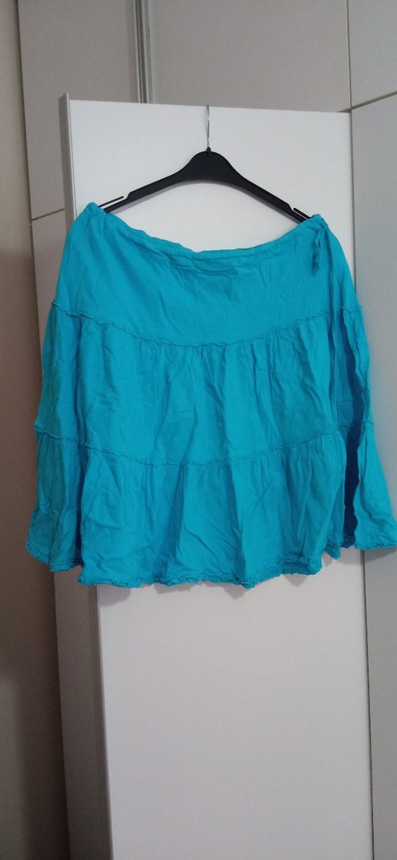 Turkuaz renkli, bol kesim midi eteği. Yumuşak keten kumaştan, fırfır detaylı ve günlük kullanıma uygun bohem tarzda.