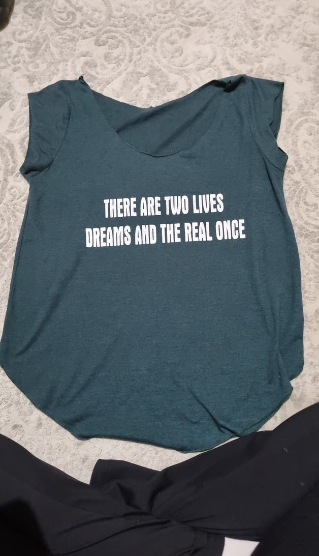 Rahat kesimli, turkuaz renkli hamile tişörtü, yuvarlak yaka ve kısa kolludur. Baskılı mesaj içerir, denim görünümlü kumaştan yapılmıştır ve günlük kullanım için zahmetsiz şıklık sunar.