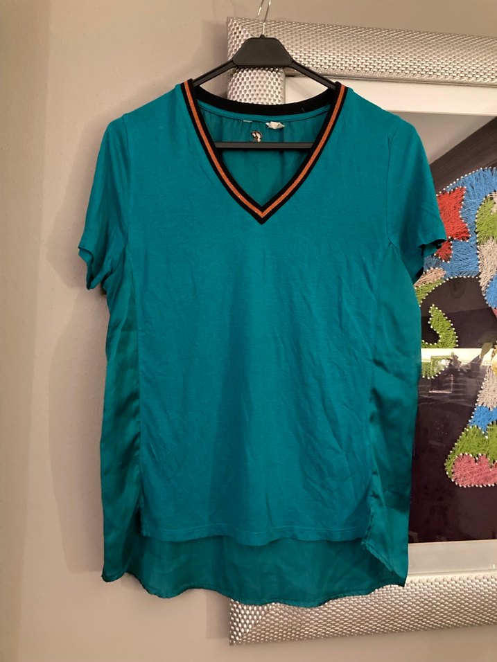 Turkuaz renkli, kısa kollu ve V yakalı bol kesim bluz. Arkası saten, önü penye. . Çok çok şık. Yaka biyeleri triko. Oldukça kaliteli . Sadece bir ütü istiyor . Arkası önünden bir tık daha uzundur . Bir kere bile giymedim. Son fiyattır.