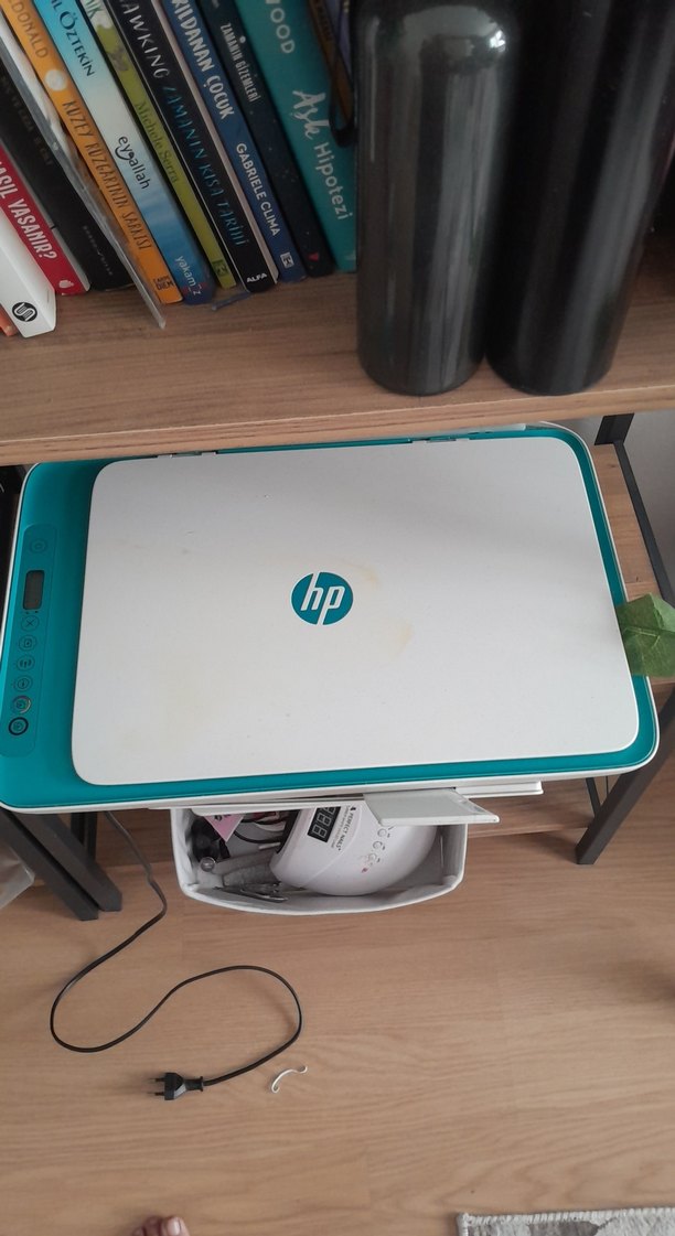 Turkuaz ve beyaz renklerde, HP marka yazıcı. Ev veya ofis kullanımı için uygun, modern tasarımlı bir ürün. ️
