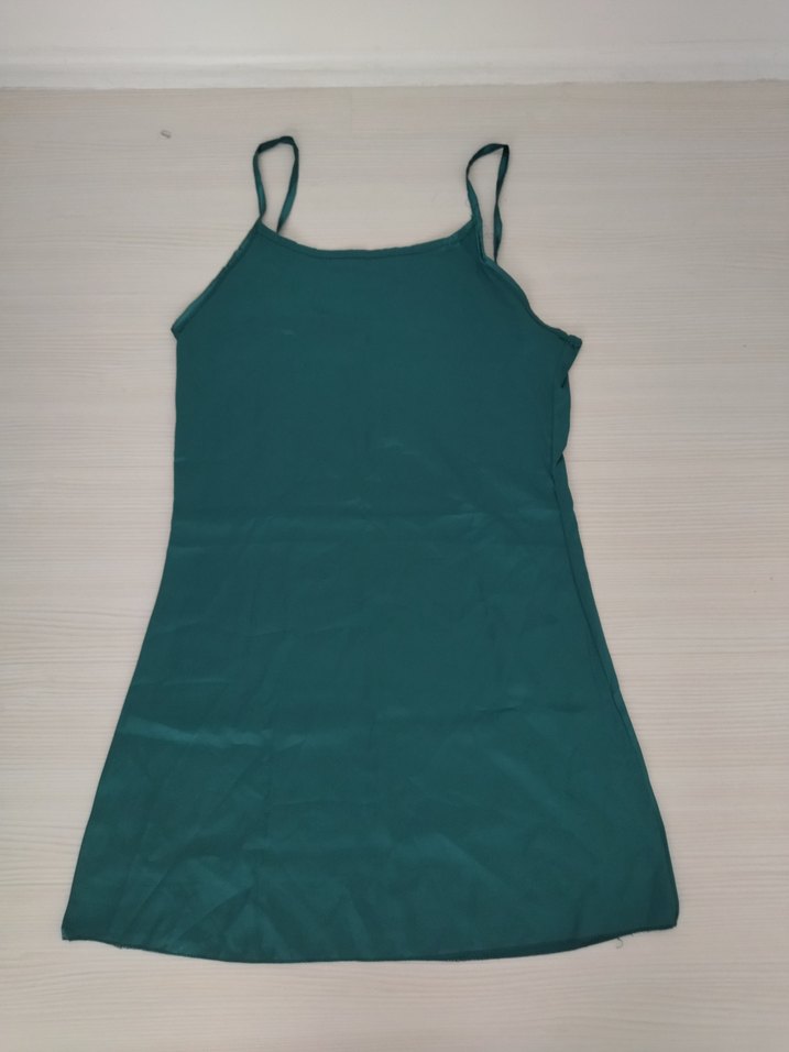 Dar kesim, ince askılı ve turkuaz renkte kadın elbisesi. Sentetik kumaştan üretilmiş, minimalist ve sokak stili için uygun, günlük kullanıma ideal. m beden saten gecelik