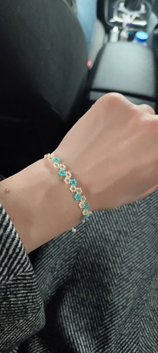 Turkuaz ve krem boncuklarla işlemeli çiçek deseni bulunan bohem tarzda bileklik, günlük kullanıma uygundur. Orijinal Miyuki boncuk kullanılmıştır. Ayarlanabilir ip sayesinde kullanımı rahattır. El emeği üründür. Renk seçenekleri mevcuttur. İstediğiniz renk kombini için msj atabilirsiniz.