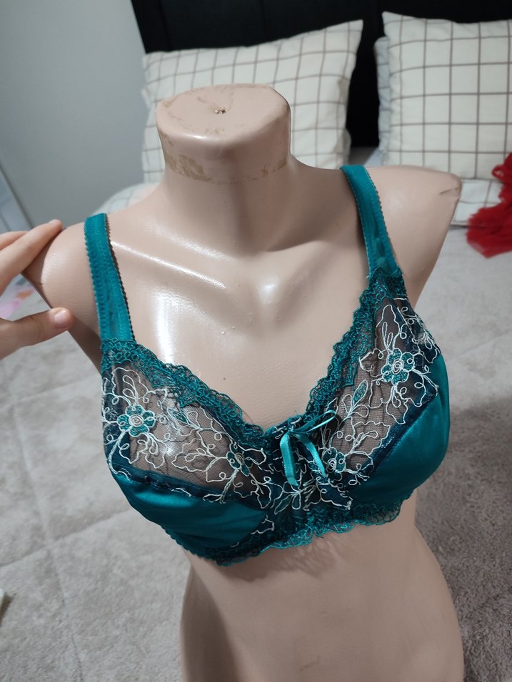Turkuaz renkli, parlak kumaş ve işlemeli detaylara sahip, ışıltılı ve bohem tarzda normal uzunlukta sütyen. İnce dantel süslemeleri bulunur. toparlayıcı