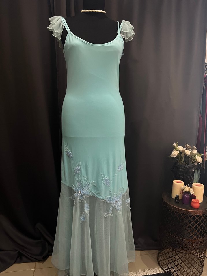Turkuaz İşlemeli Uzun Abiye Elbise