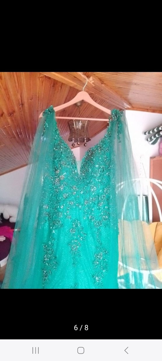 Turkuaz İşlemeli Uzun Abiye Elbise özel dikim